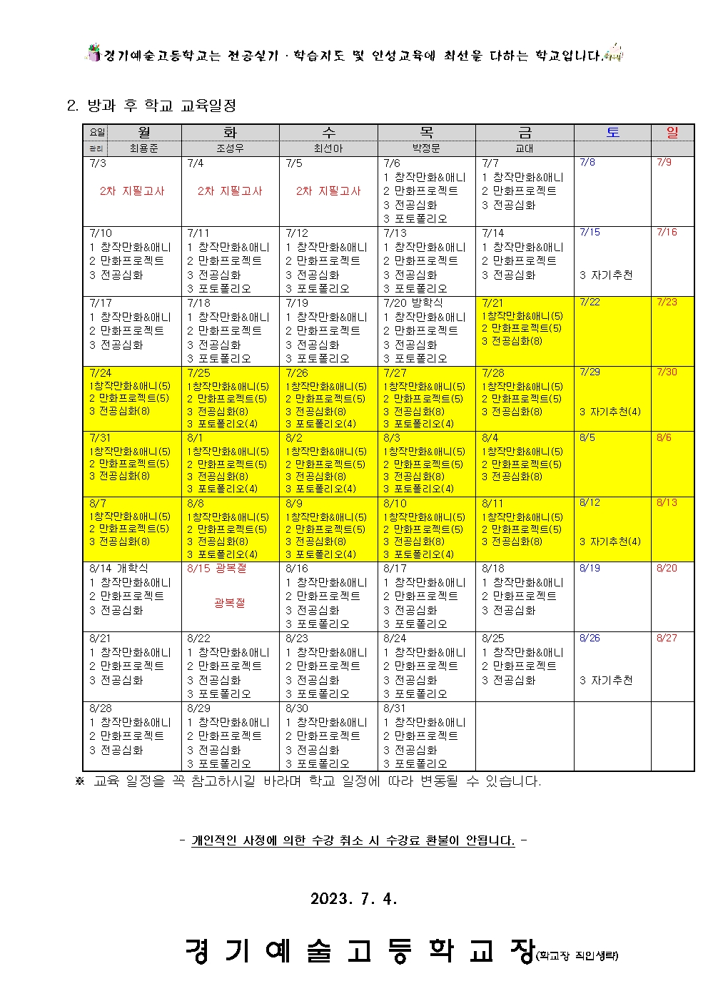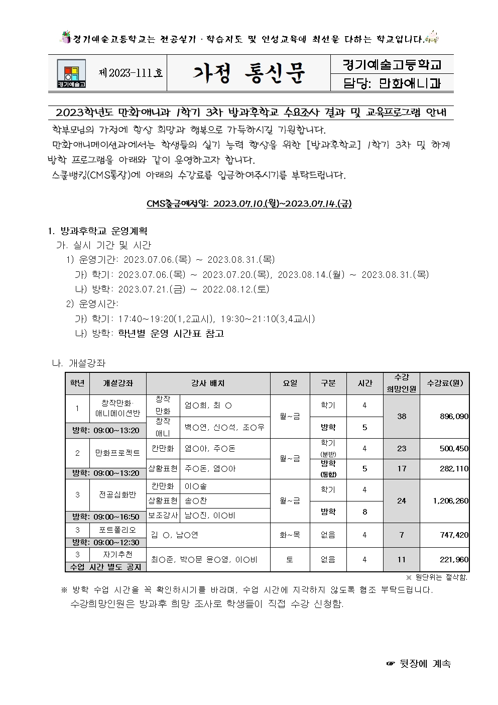 Á¦2023-111È£ 2023Çг⵵ ¸¸È­¾Ö´Ï¸ÞÀ̼ǰú 1Çбâ 3Â÷ ¹æ°úÈÄÇб³ ¼ö¿äÁ¶»ç °á°ú ¹× ±³À°ÇÁ·Î±×·¥ ¾È³»
