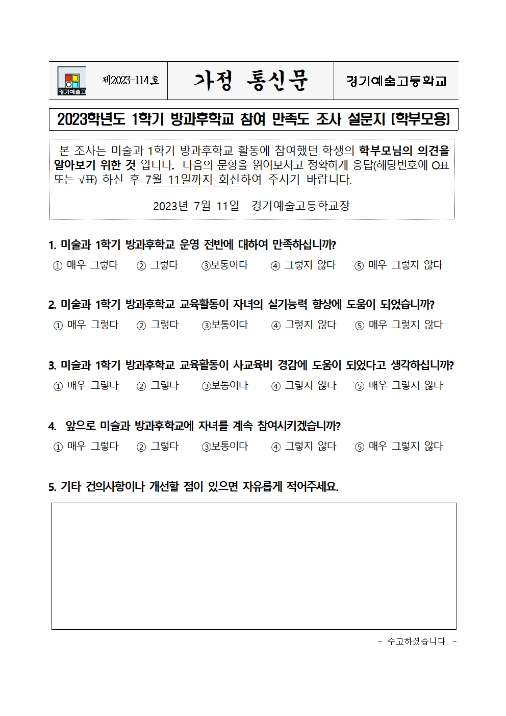 Á¦2023-113,114È£ 2023Çг⵵ 1Çб⠹æ°úÈÄÇб³ Âü¿© ¸¸Á·µµ Á¶»ç ¼³¹®Áö (Çлý¿ë,Çкθð¿ë)