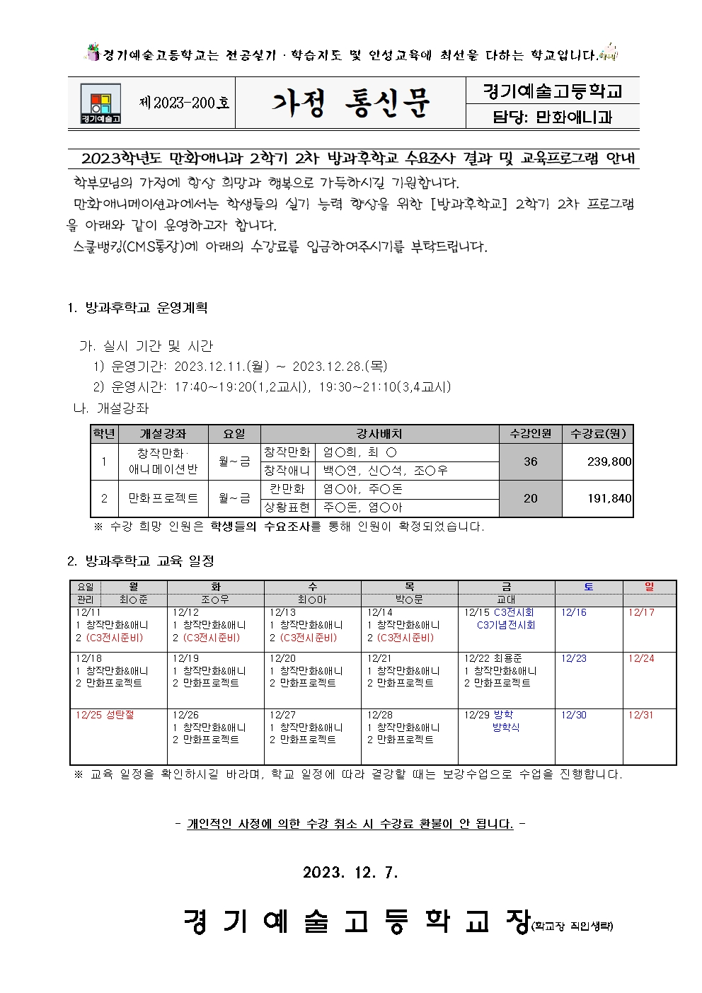 Á¦2023-200È£ 2023Çг⵵ ¸¸È­¾Ö´Ï°ú 2Çбâ 2Â÷ ¹æ°úÈÄÇб³ ¼ö¿äÁ¶»ç °á°ú ¹× ±³À°ÇÁ·Î±×·¥ ¾È³»