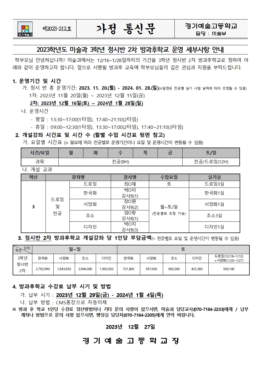 Á¦2023-212È£ 2023Çг⵵ ¹Ì¼ú°ú 3Çгâ Á¤½Ã¹Ý 2Â÷ ¹æ°úÈÄÇб³ ¿î¿µ ¼¼ºÎ»çÇ× ¾È³»