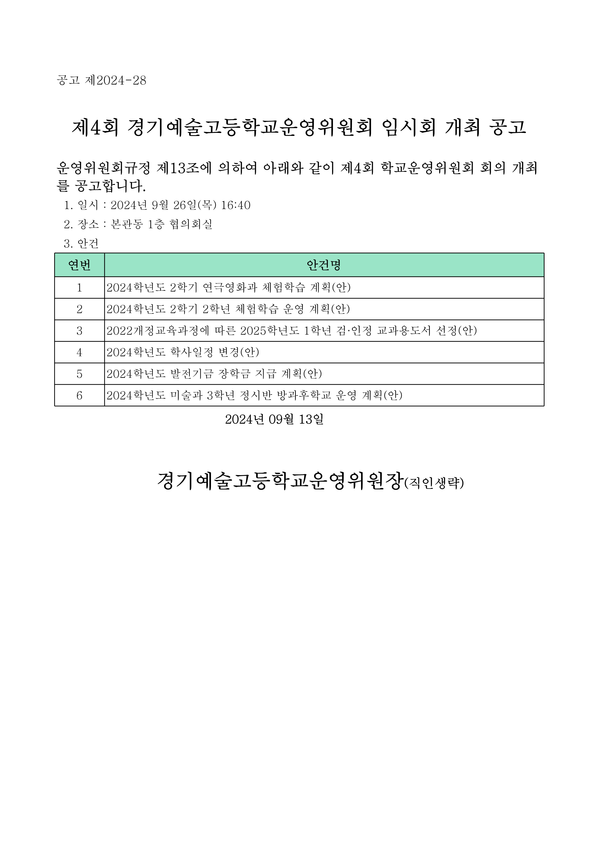 Á¦4ȸ °æ±â¿¹¼ú°í Çб³¿î¿µÀ§¿øÈ¸ ÀÓ½Ãȸ °³ÃÖ °ø°í