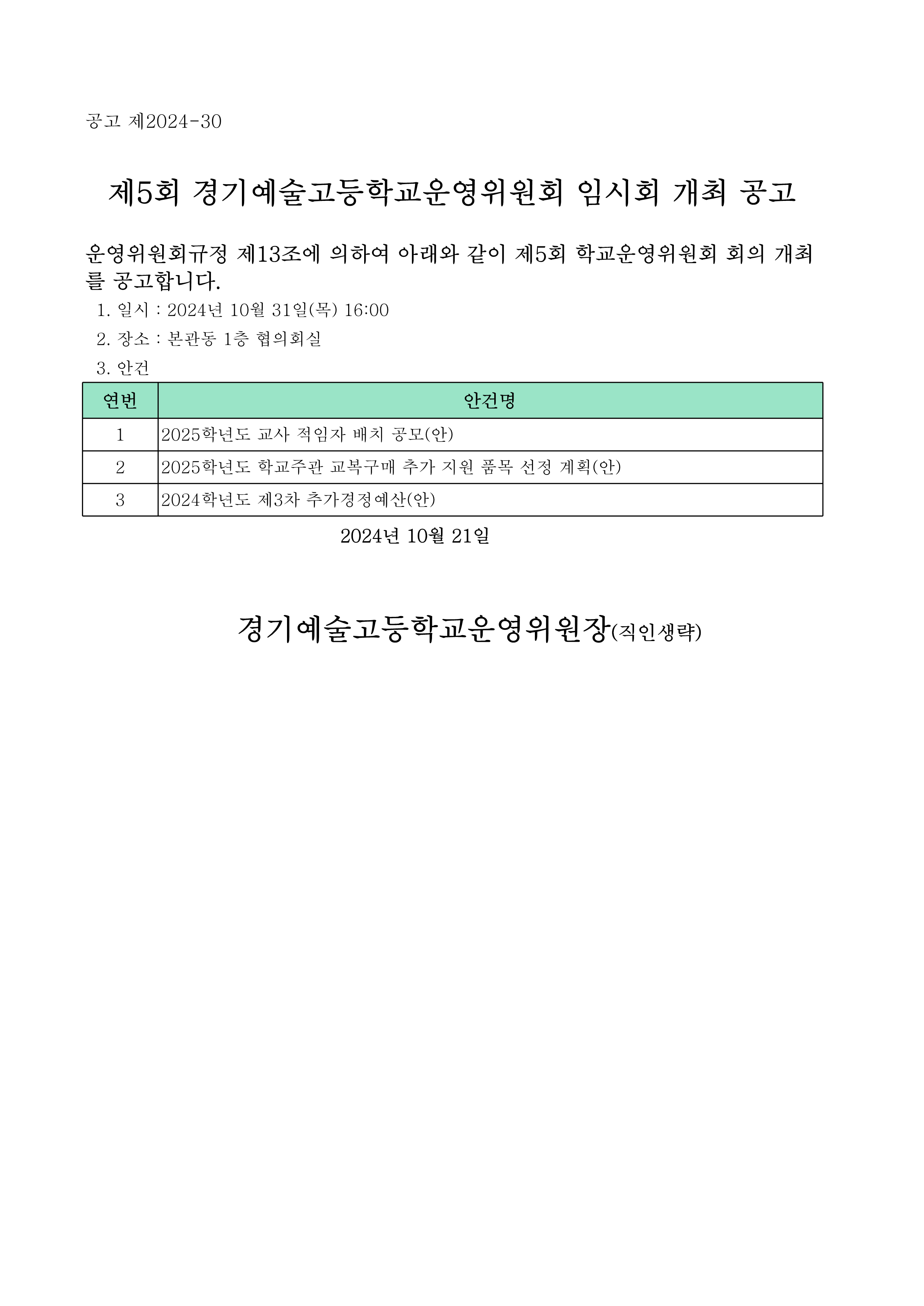 Á¦5ȸ Çб³¿î¿µÀ§¿øÈ¸ ÀÓ½Ãȸ °³ÃÖ °ø°í