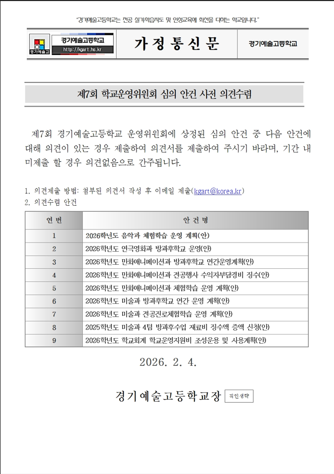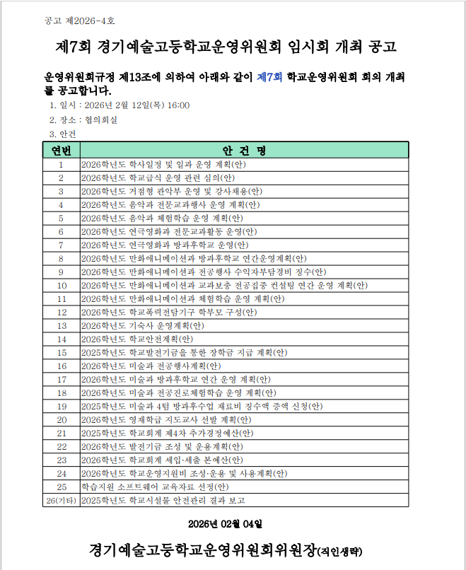 2025Çг⵵ Á¦7ȸ Çб³¿î¿µÀ§¿øÈ¸ ÀÓ½Ãȸ °³ÃÖ °ø°í ¹× ½ÉÀÇ ¾È°Ç »çÀü Àǰ߼ö·Å